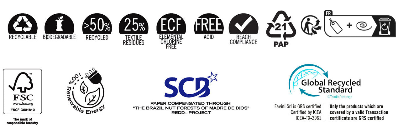Zertifiziert nach GRS und FSC™, wird es unter Verwendung von 100% selbst erzeugter Wasserkraft von Favini produziert.