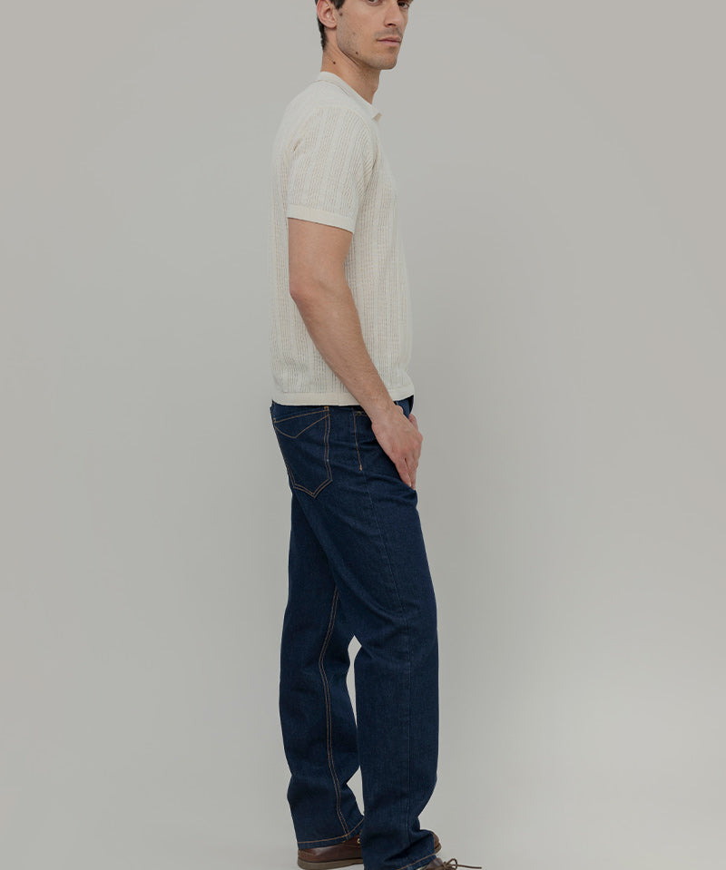 100% cotton denim tends to soften and slightly mold to the body with wear but returns to shape after washing. Since it contains no elastane, it maintains a stable fit over time.