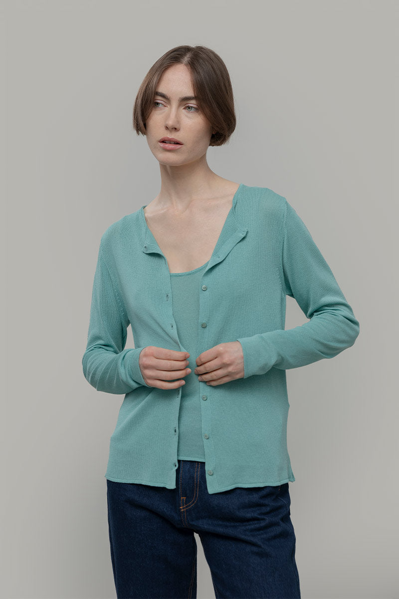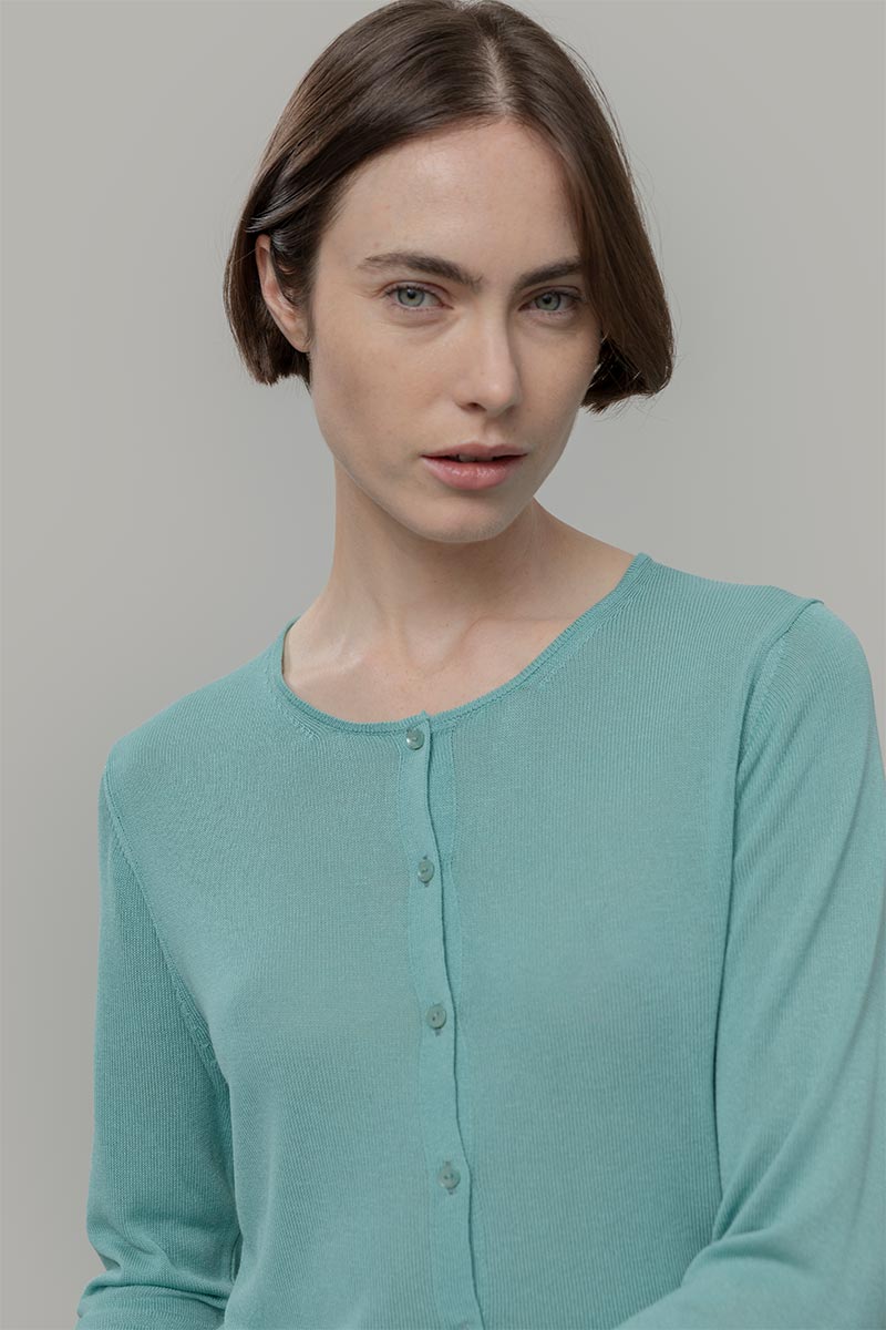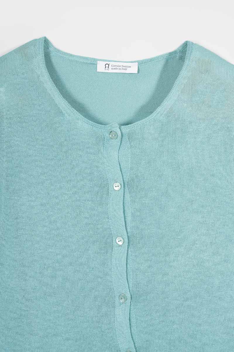 Vanessa è un cardigan girocollo con bottoni e maniche lunghe, molto leggero e perfetto per l'estate. È realizzato con un filato in 100% viscosa, di cui una parte riciclata da scarti industriali.