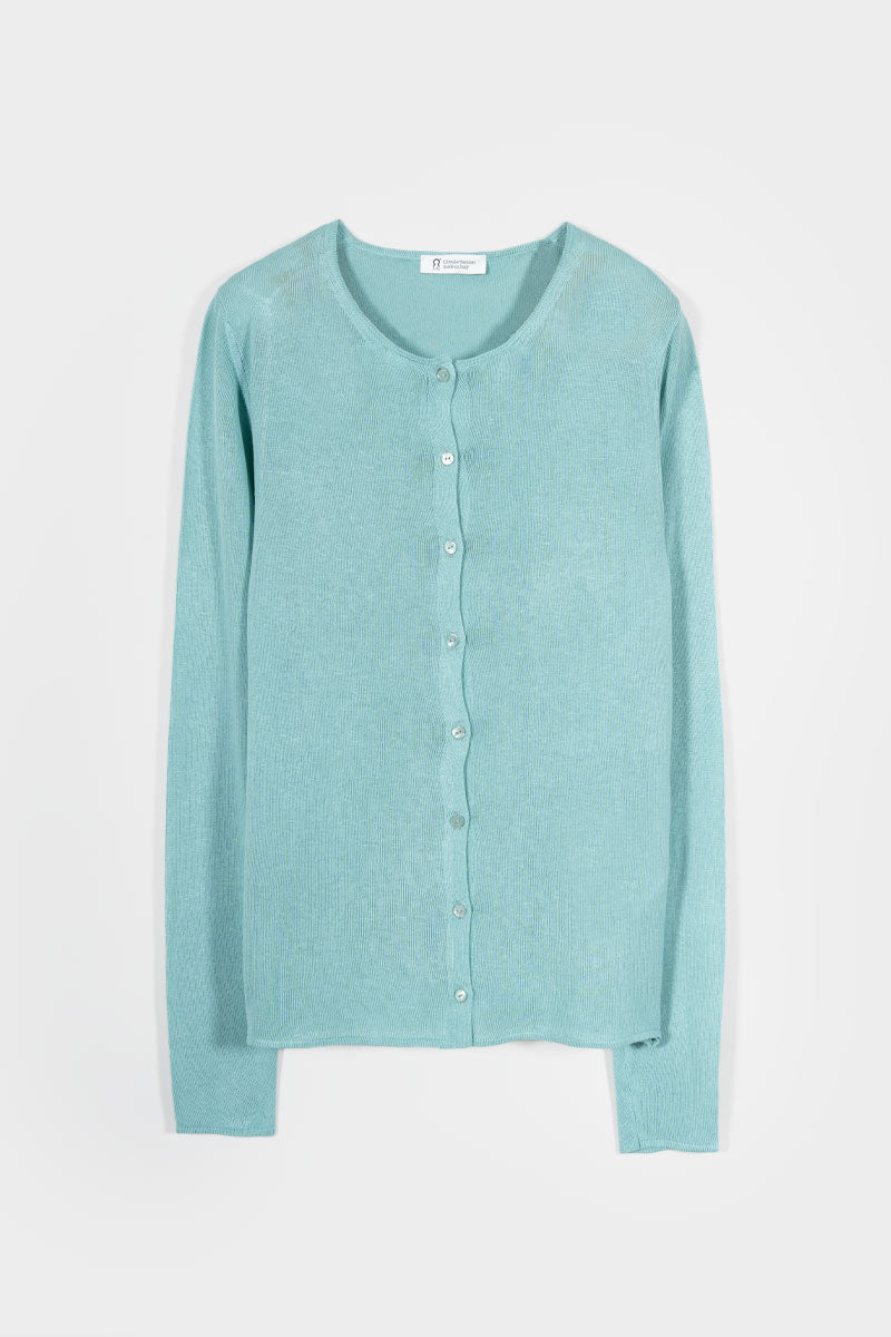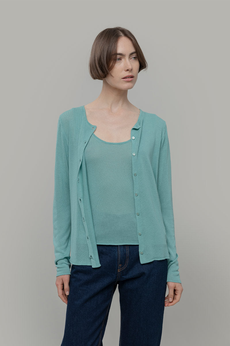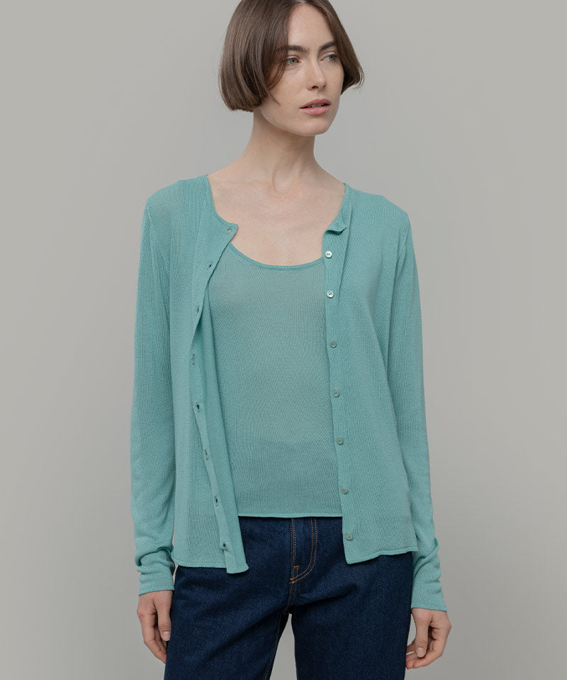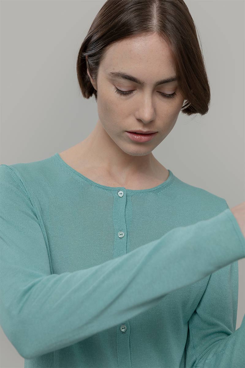 Vanessa è un cardigan girocollo con bottoni e maniche lunghe, molto leggero e perfetto per l'estate. È realizzato con un filato in 100% viscosa, di cui una parte riciclata da scarti industriali.